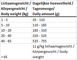 | Het voedingsadvies is gebaseerd op een normale energiebehoefte van uw hond. De lichaamsconditie van uw hond is de leidraad voor de actuele voergift. Indien nodig kunt u meer of minder voer geven om uw hond in optimale conditie te houden. | |